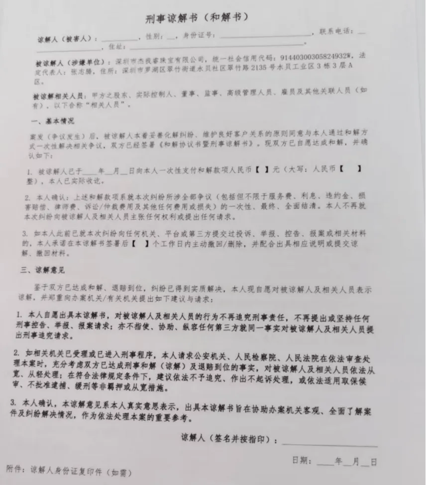 “协议里写得很清楚,一旦我们签署,就不能再在网络上、私下里提及任何与杰我睿相关的事宜,哪怕是和其他受害者交流,只要被平台发现,就要承担10万元的赔偿责任。”