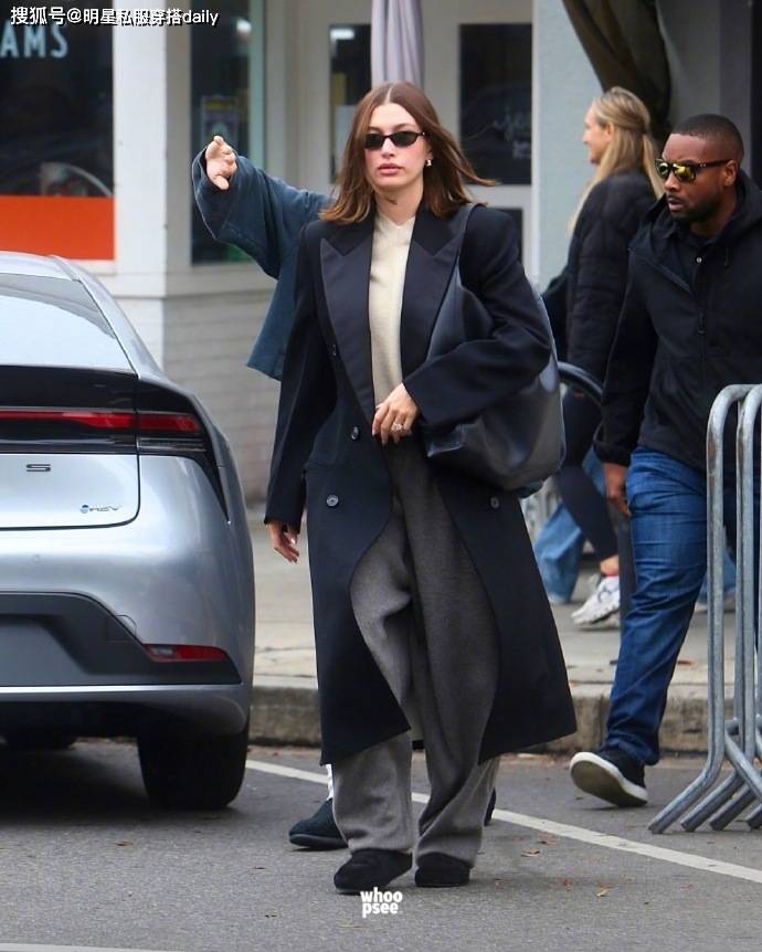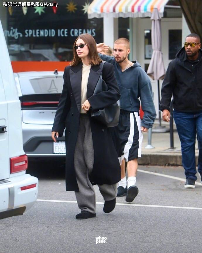 私下里,二人穿搭就很随意了!海莉喜欢宽松的卫裤,搭配宽松的廓形大衣,主打一个欧美大女主感!而她的老公比伯总是穿着宽松的卫衣和裤子,跟在身后,就像保镖一样!