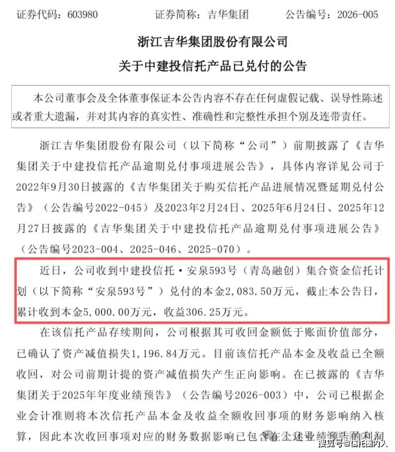 从兑付进展来看,吉华集团近日公告称,已累计收到该信托计划本金5000万元及收益306.25万元,实现全额收回。值得注意的是,吉华集团在信托存续期间,曾针对该产品可收回金额低于账面价值部分确认资产减值损失1196.84万元,此次全额兑付将对前期计提的减值损失产生正向影响,也印证了风险处置的实际成效。