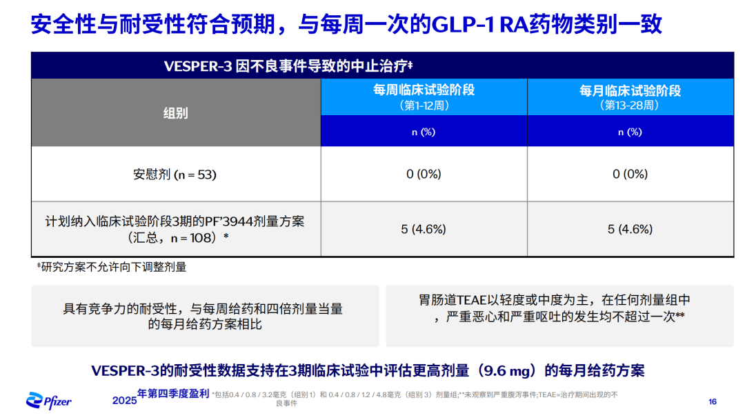 另一个视角是,在前面提到的VESPER-1研究(无需滴定1.2mg每周给药一次),239名参与者中,总研究退出率仅2.9%,因AE停药仅2/239例(0.8%);VESPER-1研究低停药率和VESPER-3研究快速升高的停药率形成反差,而辉瑞区分1-12周退出人数和13-28周退出人数相当是想告诉市场,每月给药一次不会引起比每周给药一次更高的停药,但梳理下来让人确实摸不着头脑或者说有些矛盾。