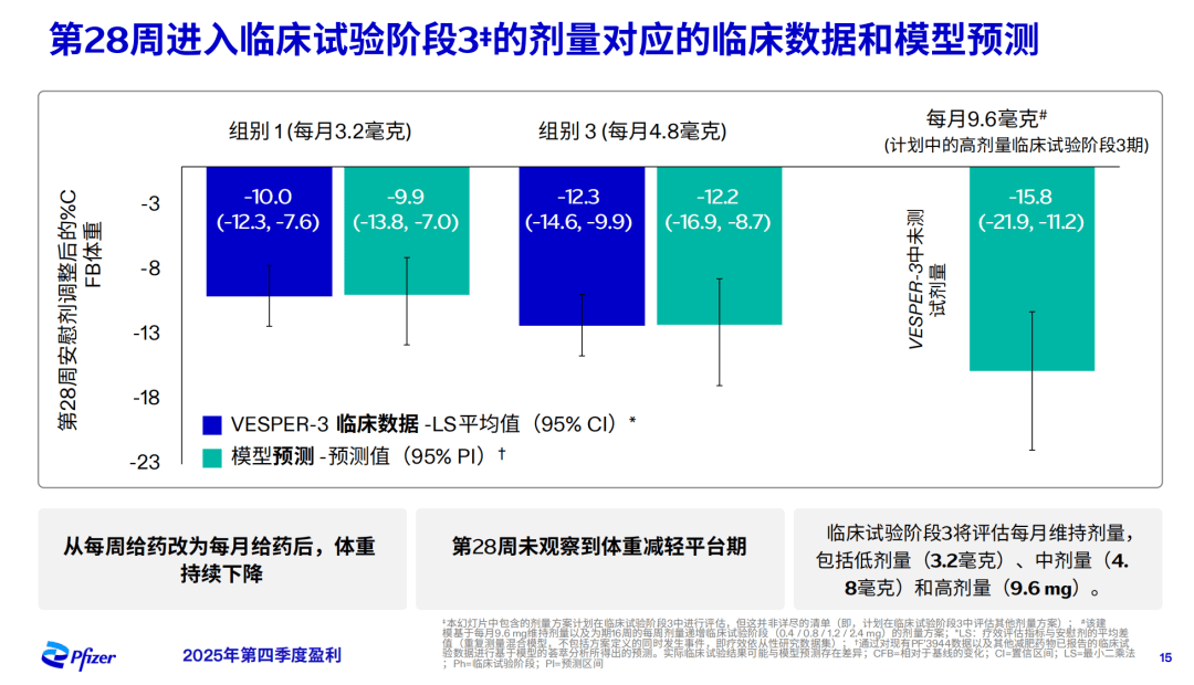 VESPER-3研究公布的PF-3944每月一次给药的28周数据显示,每月3.2mg组经安慰剂校正减重幅度为10%,每月4.8mg组经安慰剂校正减重幅度为10%,研究中并未测试每月9.6mg剂量。