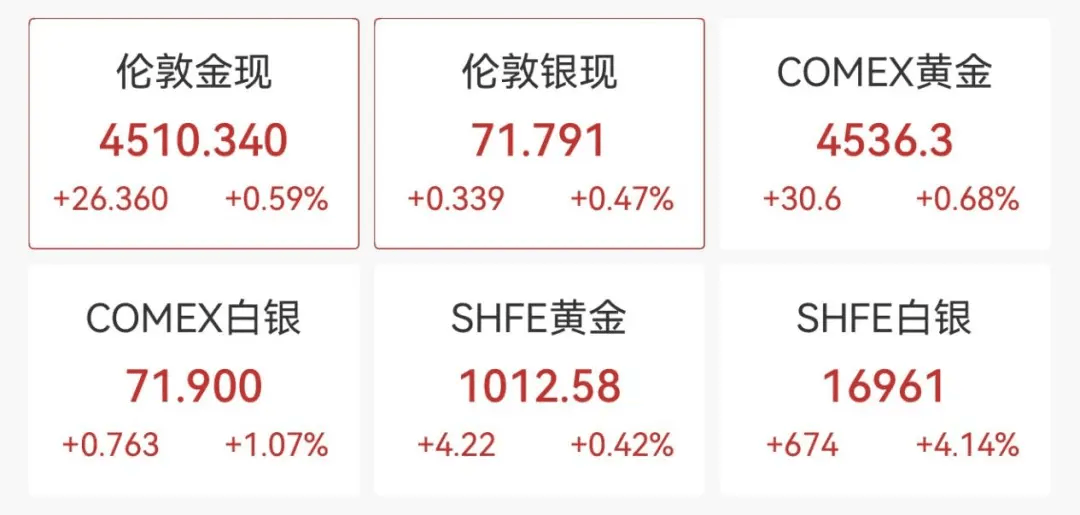 国际贵金属期货普遍上涨,现货白银突破70美元/盎司。COMEX黄金期货涨0.68%,报4536.3美元/盎司;COMEX白银期货涨1.07%报71.9美元/盎司,均创历史新高。