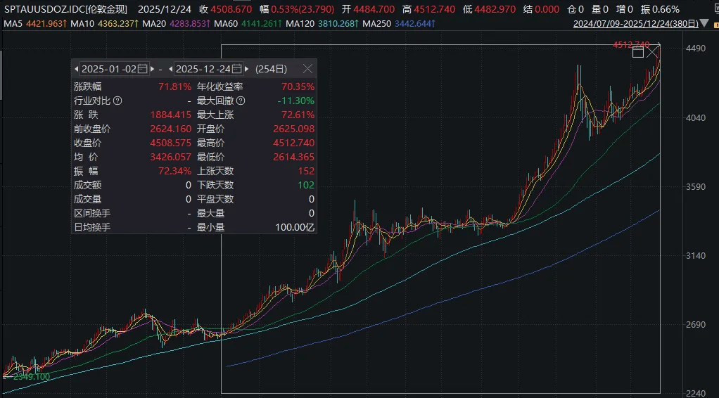 12月24日,现货黄金史上首次站上4510美元/盎司,今年累计上涨超71%。
