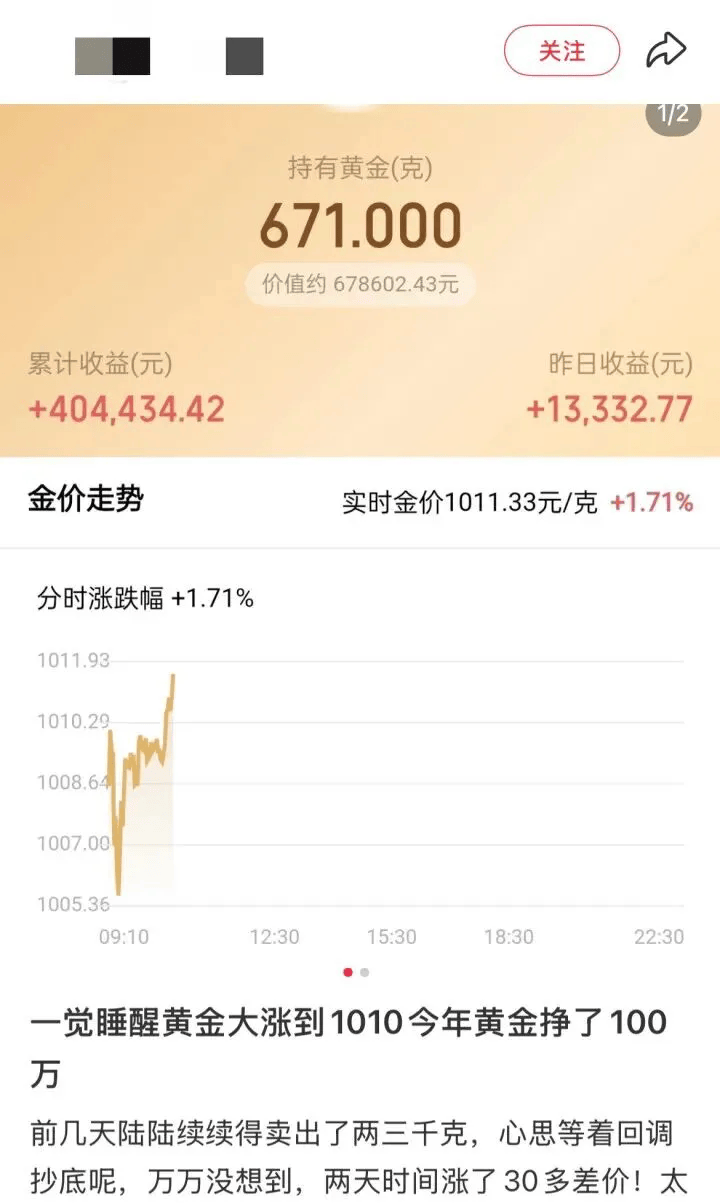 据媒体报道,23日早上,一位博主晒出今年持有黄金的收益情况:“一觉睡醒黄金大涨到1010,今年黄金挣了100万元”!