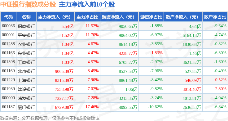 资金流向方面,中证银行(399986)指数成份股当日主力资金净流入合计11.05亿元,游资资金净流出合计6.13亿元,散户资金净流出合计4.92亿元。成份股资金流向详情见下表: