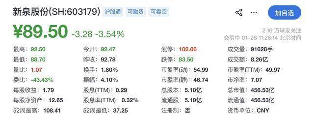 截至发稿,新泉股份跌3.54%,报89.5元,总市值为456.53亿元。