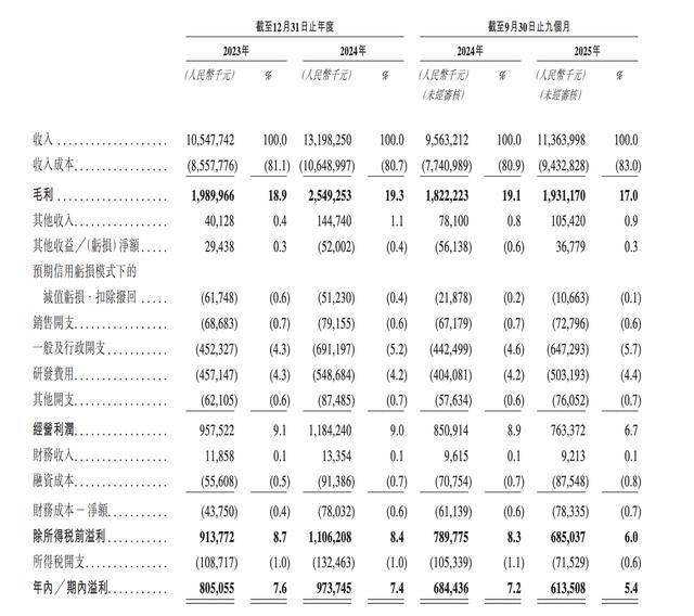 2023年、2024年及2025年前9月,新泉股份收入分别为105.48亿元、131.98亿元、113.64亿元,年内╱期内溢利分别为8.05亿元、9.74亿元、6.14亿元,毛利率分别为18.9%、19.3%、17%。