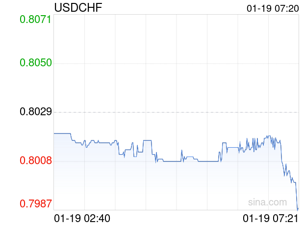 新浪外汇消息2026年01月19日,截至07时20分,外汇市场上美元兑瑞士法郎汇率跌破1美元兑换0.7988瑞士法郎。跌幅为-0.5107%