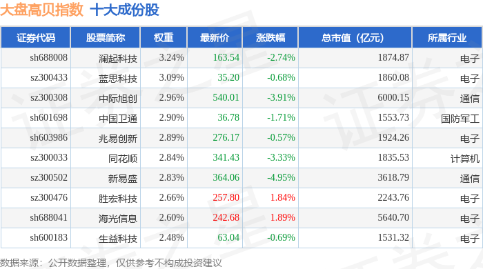 大盘高贝(399405)指数十大成份股详情如下: