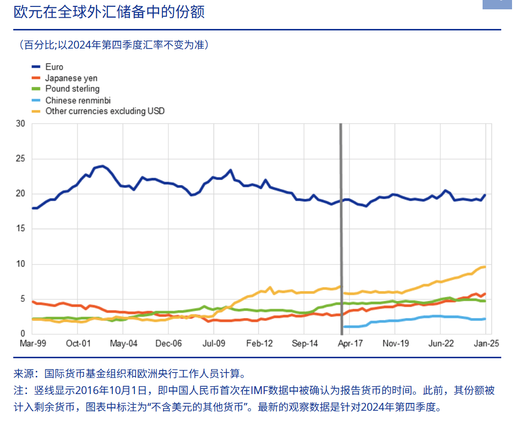 图为欧元在全球外汇储备中的份额 图片来源:欧洲央行