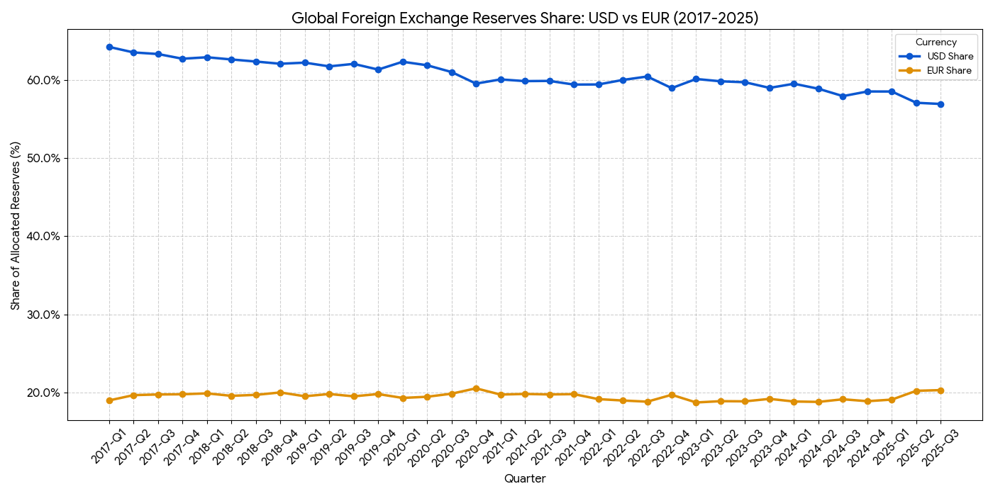 2025年,各国央行对单一储备货币依赖的警惕明显上升。国际货币基金组织(IMF)数据显示,截至2025年第三季度,美元在全球外汇储备中的占比已降至56.92%,创下30年来新低,并连续11个季度低于60%。美元地位像是经历一场缓慢却持续的“滑落”,也体现出全球外汇储备体系正在寻找新的平衡点。