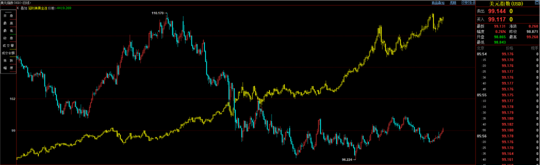 刚刚过去的一周,美元指数继续回升,为连续第二周。当周开盘价98.41,盘中最高99.268,最低98.16,最终当周收于99.131,涨幅0.7%。