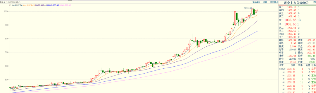 刚刚过去的一周,是元旦后的第一个交易周,国内黄金期货实现开门红,主力合约止跌回升,小幅走强。国内黄金主力连续合约,当周开盘价991元/克,最高1011元/克,最低价988.52元/克,收盘价1006.48元/克,上涨28.92元/克,涨幅2.96%。