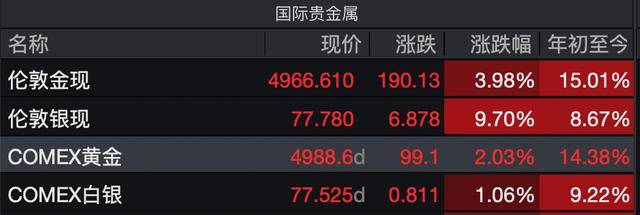 然而,剧烈下跌后迅速出现反弹。截至2月6日收盘,现货白银报收77.78美元/盎司大涨9.7%。与此同时,现货黄金自周一大幅抛售后的低点4400美元/盎司附近强劲反弹,年初至今涨幅上升到15.01%,截至2月6日收盘报收4966.61美元/盎司,年初至今上涨15.01%。