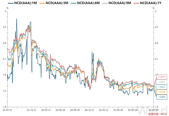 全国和主要股份制银行一年期同业存单最新成交在1.58%附近,较上日小幅下行。