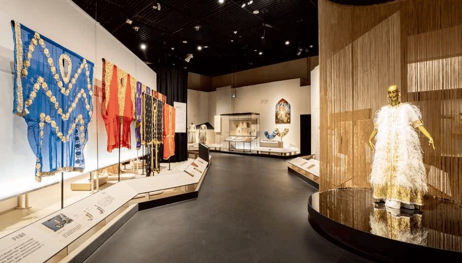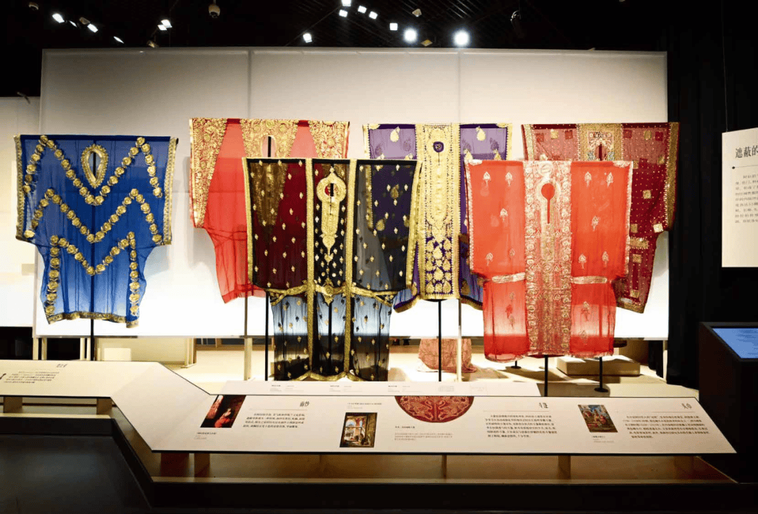 展览以丝路地理脉络为叙事线索,分为“日落金辉:马格里布的明亮服饰”“沙海星穹:中东地区的织金艺术”“天方织韵:阿拉伯半岛的信仰美学”“绫罗生香:印度与东南亚世界的金缕华裳”“经纬鎏光:东方丝国的金色记忆”五大单元,通过200余件/套珍贵藏品,串联起从北非到东亚的织金服饰文明史。