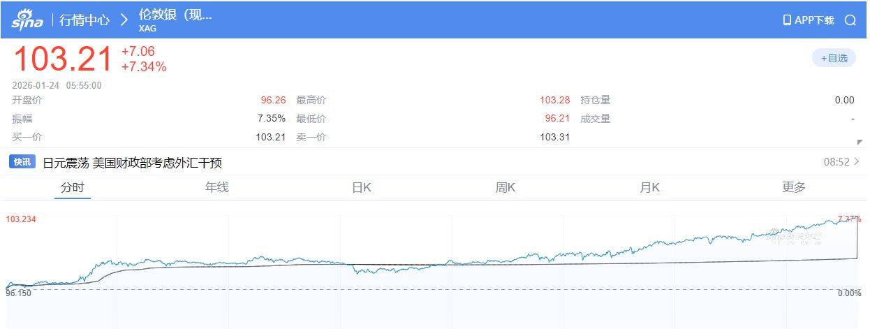 1月23日,COMEX(纽约商品交易所)白银期货涨7.15%,报103.26美元/盎司,本周累计上涨16.63%,年初至今已累涨超40%。