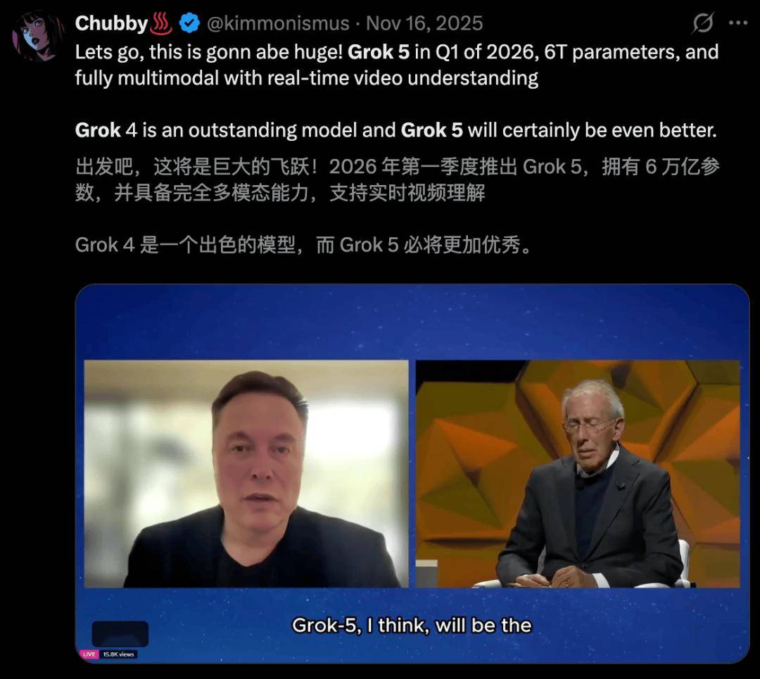 此前,在一期采访中,马斯克还表示Grok 5拥有高达6万亿参数,而且智能密度更高,预计将在上半年发布。