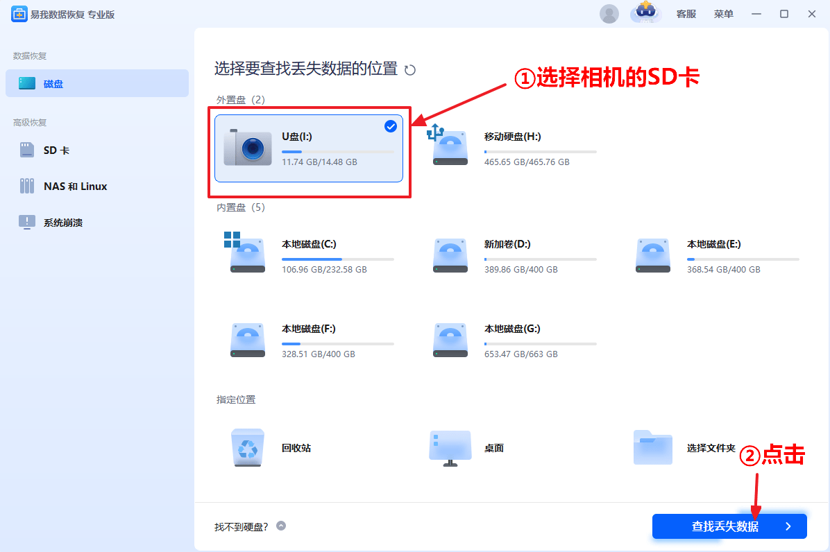 选择目标储存卡:将格式化后的储存卡通过读卡器连接电脑,软件会自动识别所有可移动存储设备。在设备列表中找到目标储存卡(可通过容量、设备名称区分),点击“查找丢失数据”按钮。