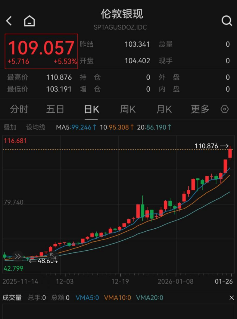1月26日,白银价格仍在走高,现货、期货一度双双站上110美元/盎司截至发稿,COMEX白银报109.505美元/盎司,涨幅超8%;伦敦银报109.057美元/盎司,涨幅超5.5%。