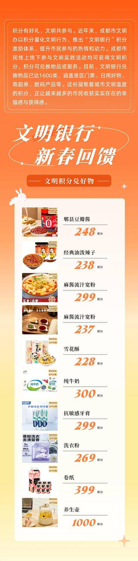 小积分撬动大文明;好福利传递暖心意。本次文明银行迎新春感恩回馈活动,既是对大家积极参与文明实践的鼓励,也是对各位文明行为的赞赏。新的一年,让我们继续携手同行,践行文明、传递善意。“文明银行”也将持续丰富兑换物品与服务品类,与您一道,以点滴善行、微小举动,温暖这座我们共同生活的城市——成都。