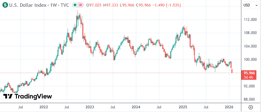财联社1月28日讯(编辑 赵昊)周二(1月27日)纽约时段,美元指数一度跌至95.51创2022年2月份的最低水平,本月累计跌幅扩大至超2.2%。