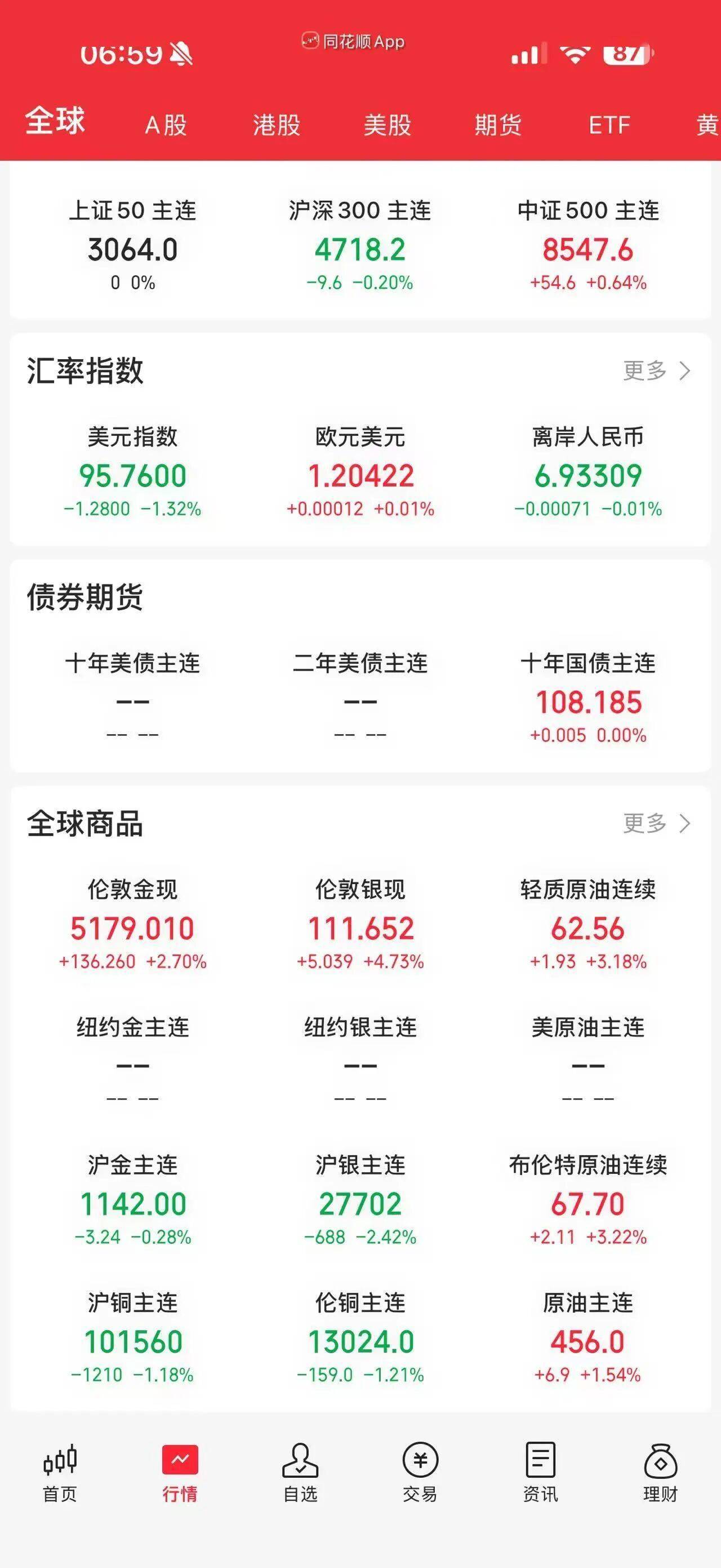 截至今晨收盘,伦敦金现货价格上涨2.7%,报5179美元/盎司,再创历史新高;纽约期金价格上涨1.88%,突破5200美元/盎司;伦敦银现货价格上涨4.73%,纽约期银价格下跌2.73%;NYMEX钯主力合约跌逾10%,NYMEX铂主力合约跌逾8% 。