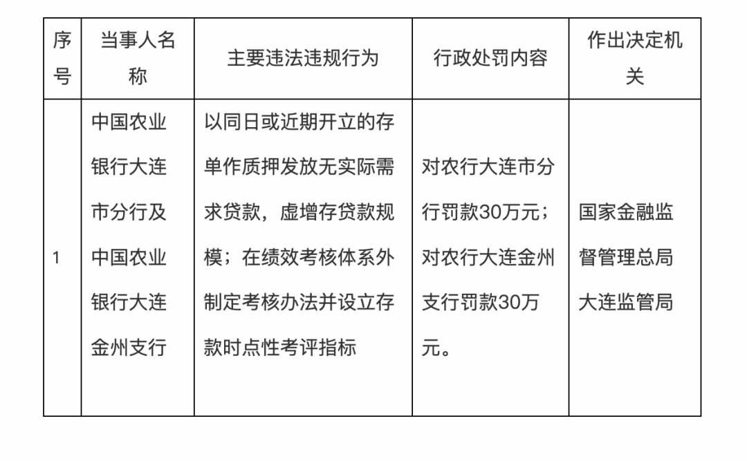 同日,中国农业银行大连市分行及大连金州支行被罚60万元,广东新兴农商银被罚80万元,中国工商银行伊通满族自治县支行被罚30万元。