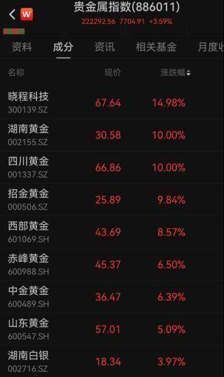 A股市场,贵金属概念集体高开,湖南黄金3连板,四川黄金涨10.00%,赤峰黄金、招金黄金、西部黄金、山东黄金高。