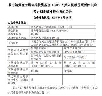 1月27日,易方达黄金主题LOF也发布公告,1月28日起暂停A类人民币份额申购及定期定额投资业务。