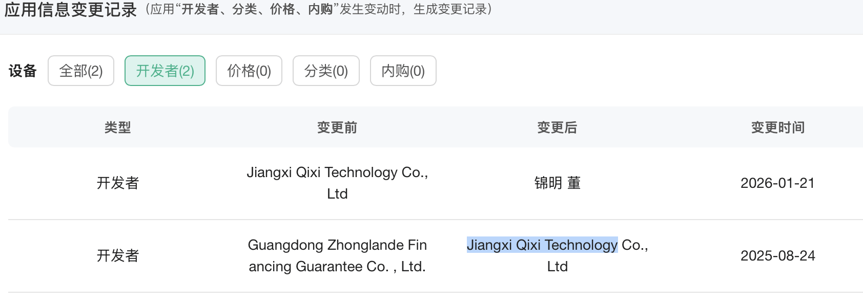 天眼查显示,江西迁享韵成立于2025年9月11日,自然人郭广华、杨海旺分别持股80%、20%。另据七麦数据,“买呗”曾用名“随时用”“随意用”,经历过两次开发者信息变更,前两者分别为“广东中兰德融资担保有限公司”、江西仟喜科技有限公司。