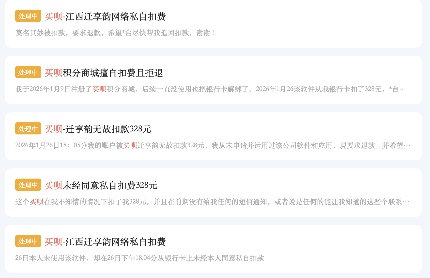 例如,2026年1月27日,有用户在消费保表示,自己于2026年1月16日在58好借贷款,1月25日宝付支付在本人不知情的情况下私自扣款。该用户诉求为“支付退款并取消自动续费授权,删除个人信息”。