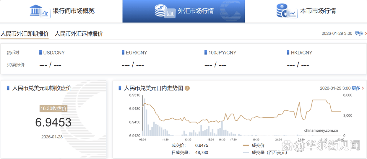 在岸人民币兑美元(CNY)北京时间03:00收报6.9475元,较周二夜盘收盘涨70点。成交量487.80亿美元。