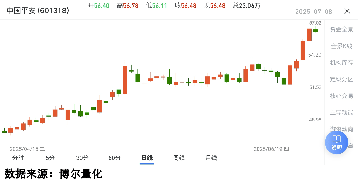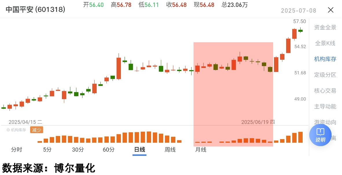 二、为什么利好出了不涨?机构早动手了举个最实在的例子:2025年6月中国平安出了“成功融资”的公告,市场没反应,结果月底突然涨了。有人说“是中东环境好,风险偏好回升”,但其实机构早就在里面“悄悄干活”了。看图1,这是当时中国平安的走势——公告出来后股价没动,但看图2里的橙色柱体(机构库存),早就开始“活跃”了。