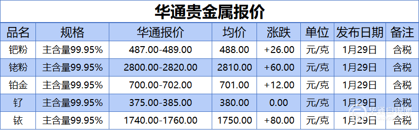 华通白银网 1月28日讯:钯粉、铑粉、铂金、钌、铱报价