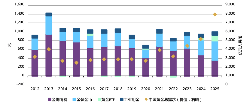 2025年中国市场黄金需求同比增长 中国市场各板块零售黄金投资与消费需求(按吨数及金额计算)1
