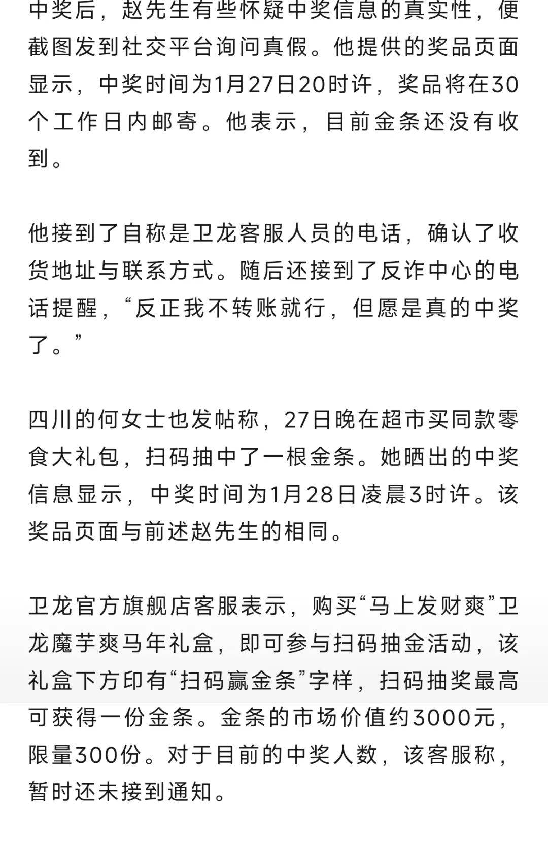 1月29日,新疆的赵先生(化姓)告诉记者,27日晚上他去超市买水果和零食,购买了一件背包造型的卫龙魔芋爽零食大礼包,“里面有三小包魔芋爽,附带一张二维码开奖卡片,我扫了一下,结果显示抽中了一份3克重的金条,价值3000元。”