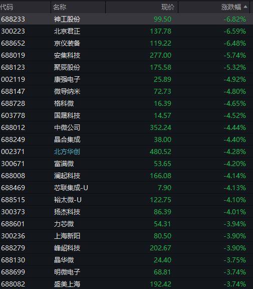 下跌方面,半导体板块冲高回落,北京君正、神工股份等跌超6%。
