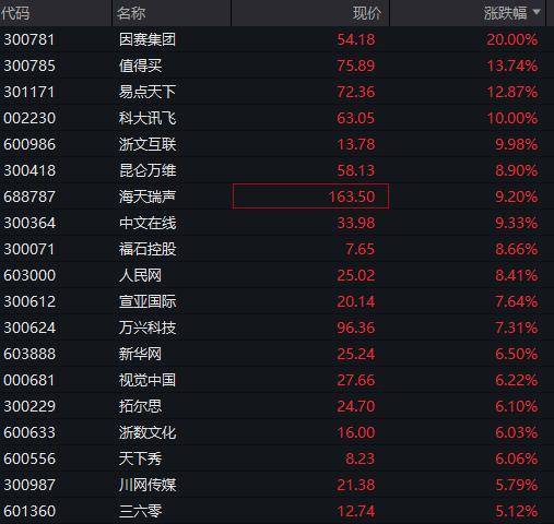 AI应用端局部异动,天地在线走出9天5板,华媒控股反包涨停,因赛集团、科大讯飞、浙文互联、蓝色光标、海天瑞声跟涨。