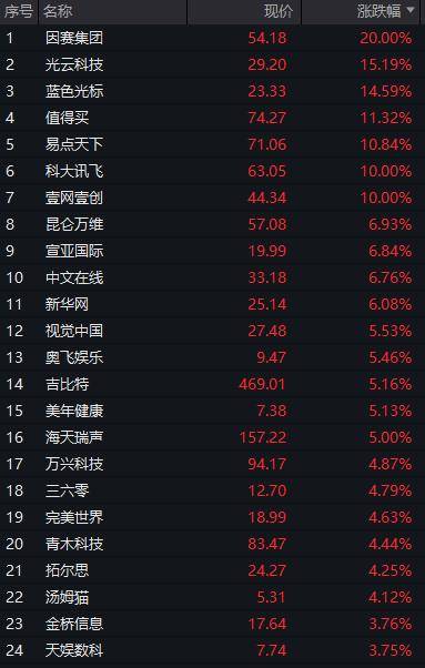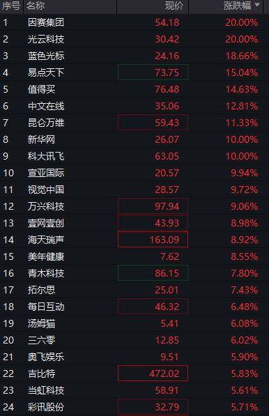 AI应用方向涨势扩大,新华网、人民网、因赛集团、引力传媒、粤传媒、科大讯飞、浙文互联等10余股封涨停板,流金科技、卓易信息、天龙集团、蓝色光标、易点天下均涨超10%。