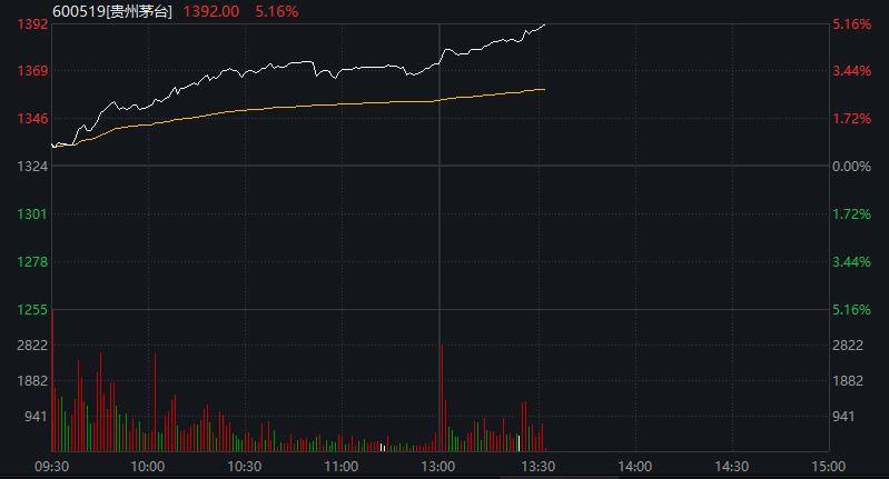贵州茅台涨幅扩大至5%,现报1389.06元。