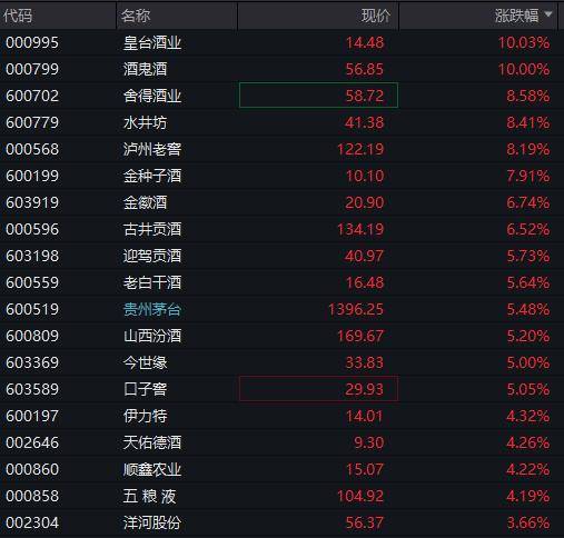 白酒股大涨,酒鬼酒涨停,水井坊、舍得酒业、金种子酒、泸州老窖涨逾8%,贵州茅台涨逾5%。