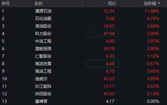 油气股继续走强,通源石油涨超10%,石化油服触及涨停,准油股份、中曼石油、科力股份、海油发展等涨幅居前。