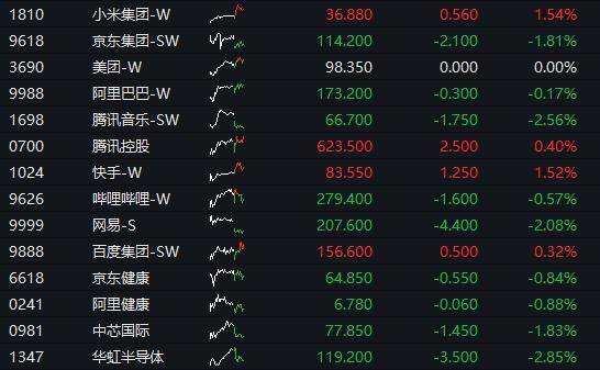 盘面上,科网股涨跌不一,网易跌超2%,京东跌超1%,小米、快手涨超1%。