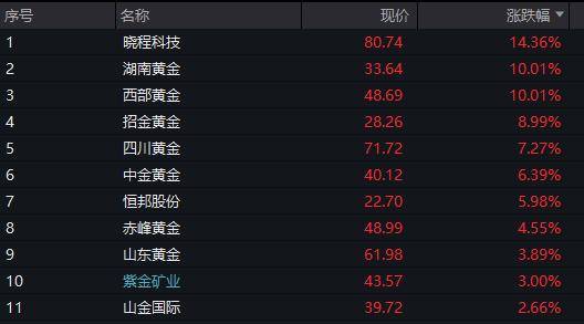 贵金属板块延续强势,西部黄金7天4板,中国黄金5连板,湖南黄金4连板,招金黄金、四川黄金、湖南白银等多股涨超5%。
