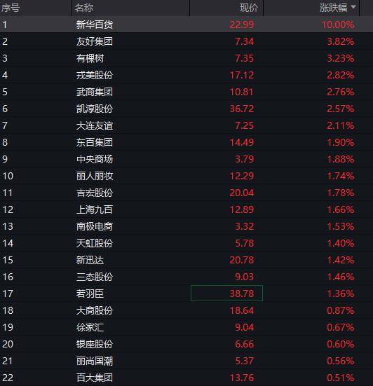 零售股午后拉升,新华百货涨停,三江购物、上海九百、东百集团、广百股份、合百集团跟涨。