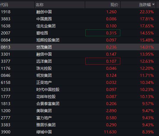 港股方面,融创中国涨超21%,中国奥园、佳兆业集团、碧桂园、旭辉控股集团、世茂集团涨幅均超过10%。