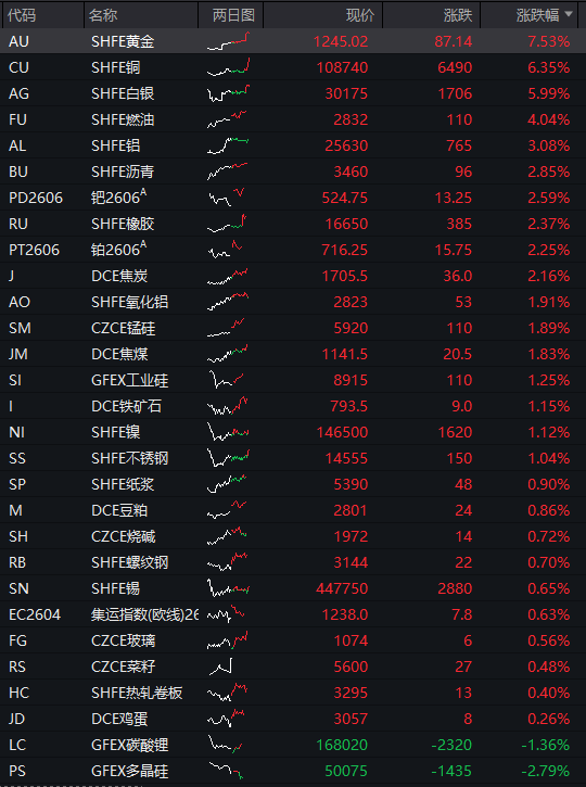 商品:国内商品期货普涨,截至发稿,贵金属涨幅居前,沪金涨7.53%;基本金属全部上涨,沪铜涨6.35%;能源品全部上涨,燃油涨4.04%;化工品多数上涨,沥青涨2.85%;黑色系全部上涨,硅铁涨2.32%;油脂油料全部上涨,豆一涨1.28%;农副产品多数上涨,苹果涨0.92%;航运期货全部上涨,集运指数(欧线)涨0.63%;非金属建材涨跌参半,玻璃涨0.56%;新能源材料跌幅居前,多晶硅跌2.79%。