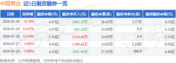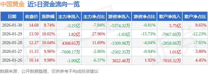 证券之星消息,截至2026年1月30日收盘,中国黄金(600916)报收于14.68元,上涨8.74%,换手率28.37%,成交量476.65万手,成交额66.42亿元。