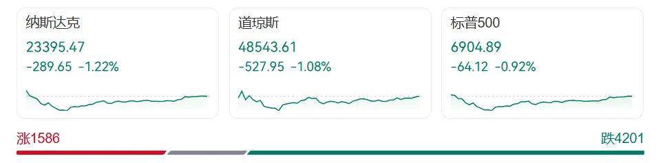 美股全线下跌,截至发稿纳指跌1.22%,道指跌超1%,标普500跌0.92%。